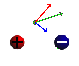 Exercise 3. Move the field point back to a position close to that shown in Figure 1 above. Independently vary the two source charges Q1 and Q2 while keeping the field point and the source objects fixed. For each of the following three cases, sketch the configurations of the field point with its three field vectors and the source objects. Indicate the values of the source charges.